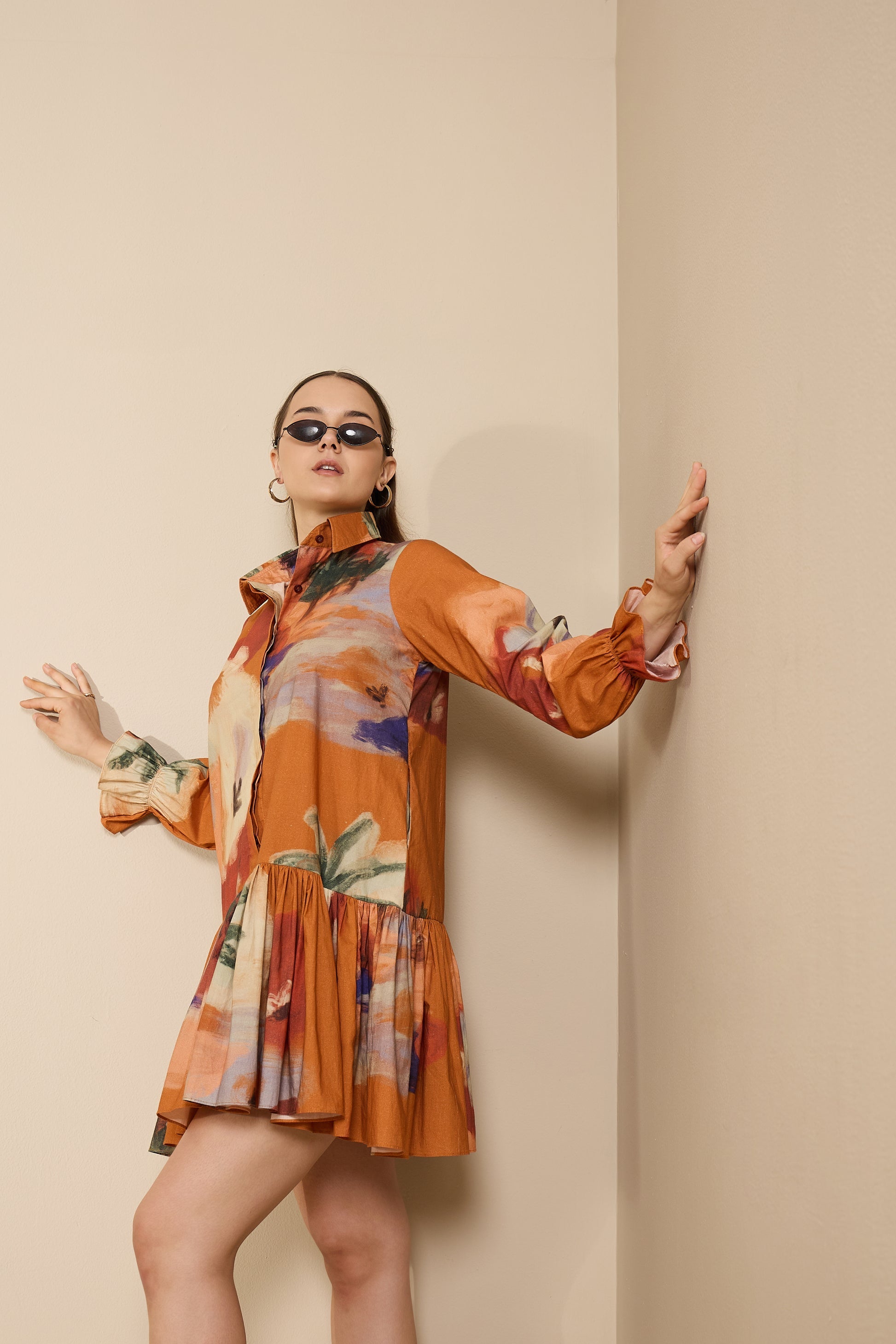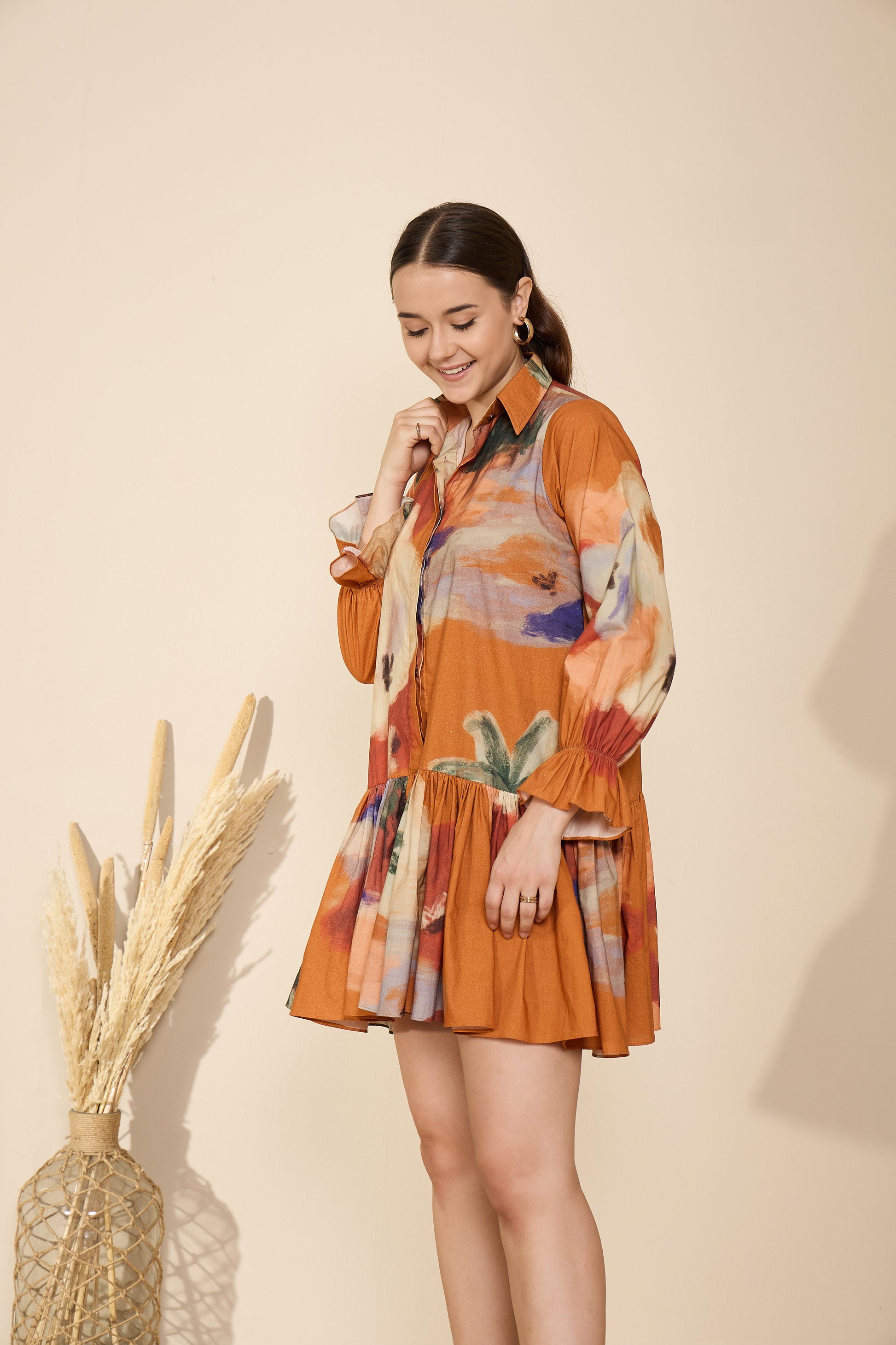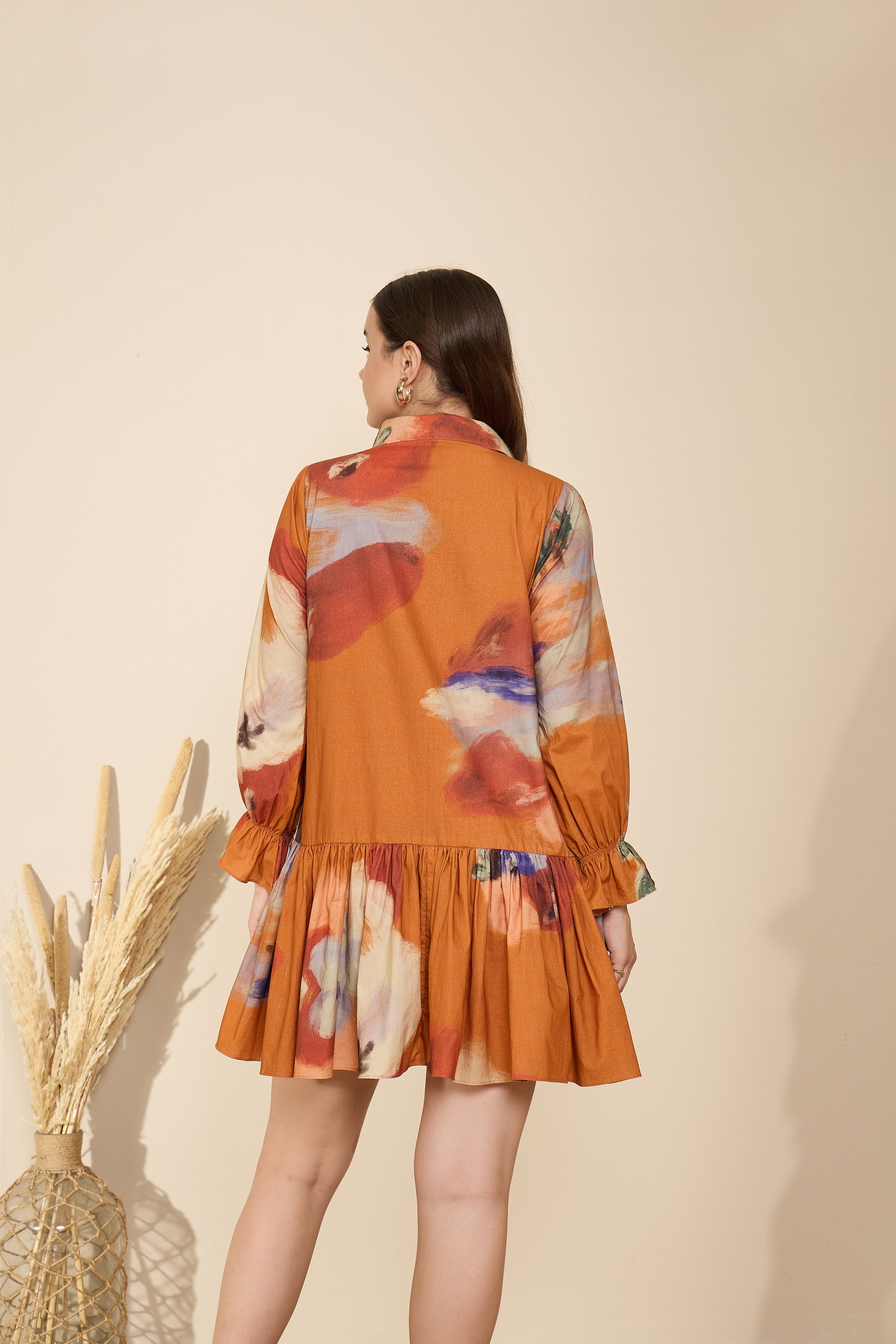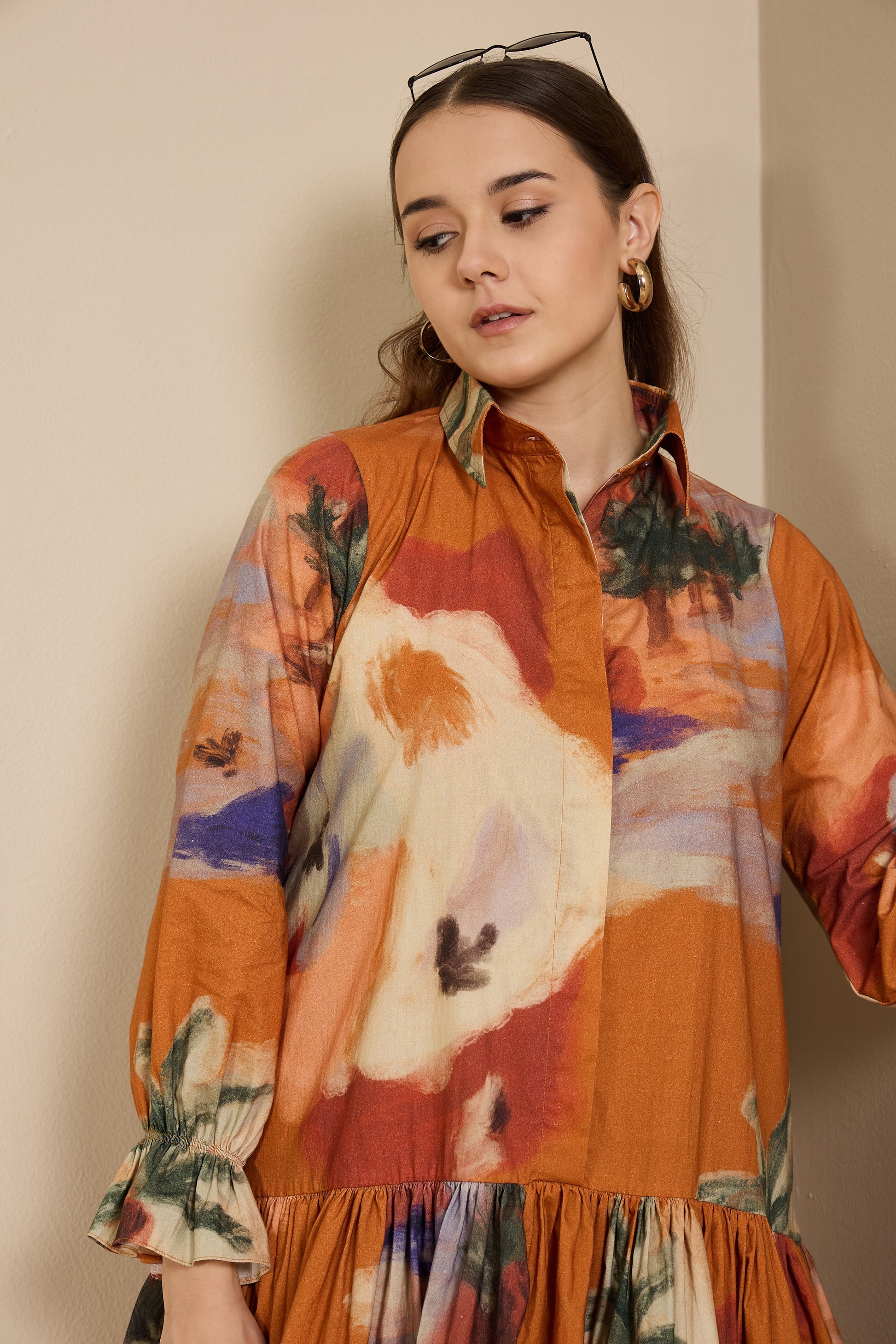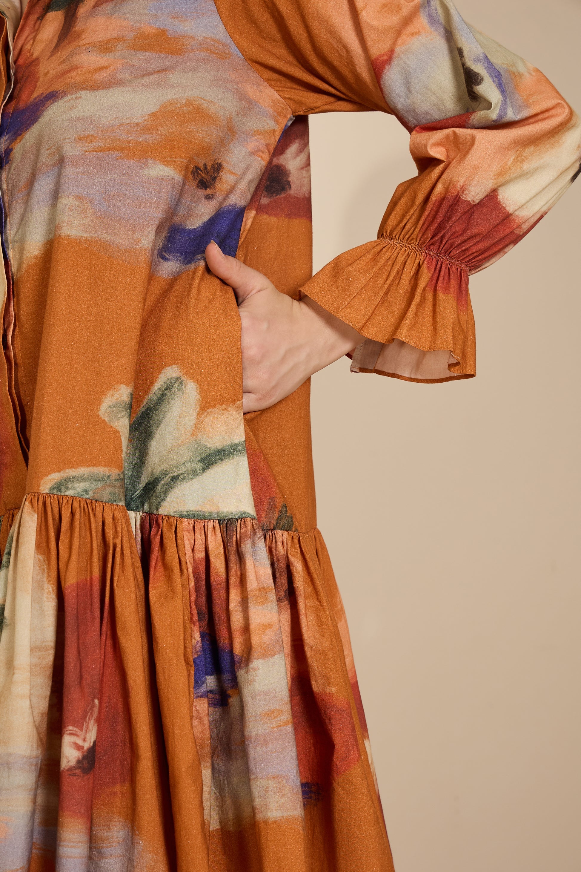 The warm terracotta base is brought to life with abstract strokes of lilac, cream, and sapphire โ a print that feels both vibrant and dreamy. Finished with gathered detailing and a flouncy hem, this dress moves beautifully, making every step feel like a soft breeze.