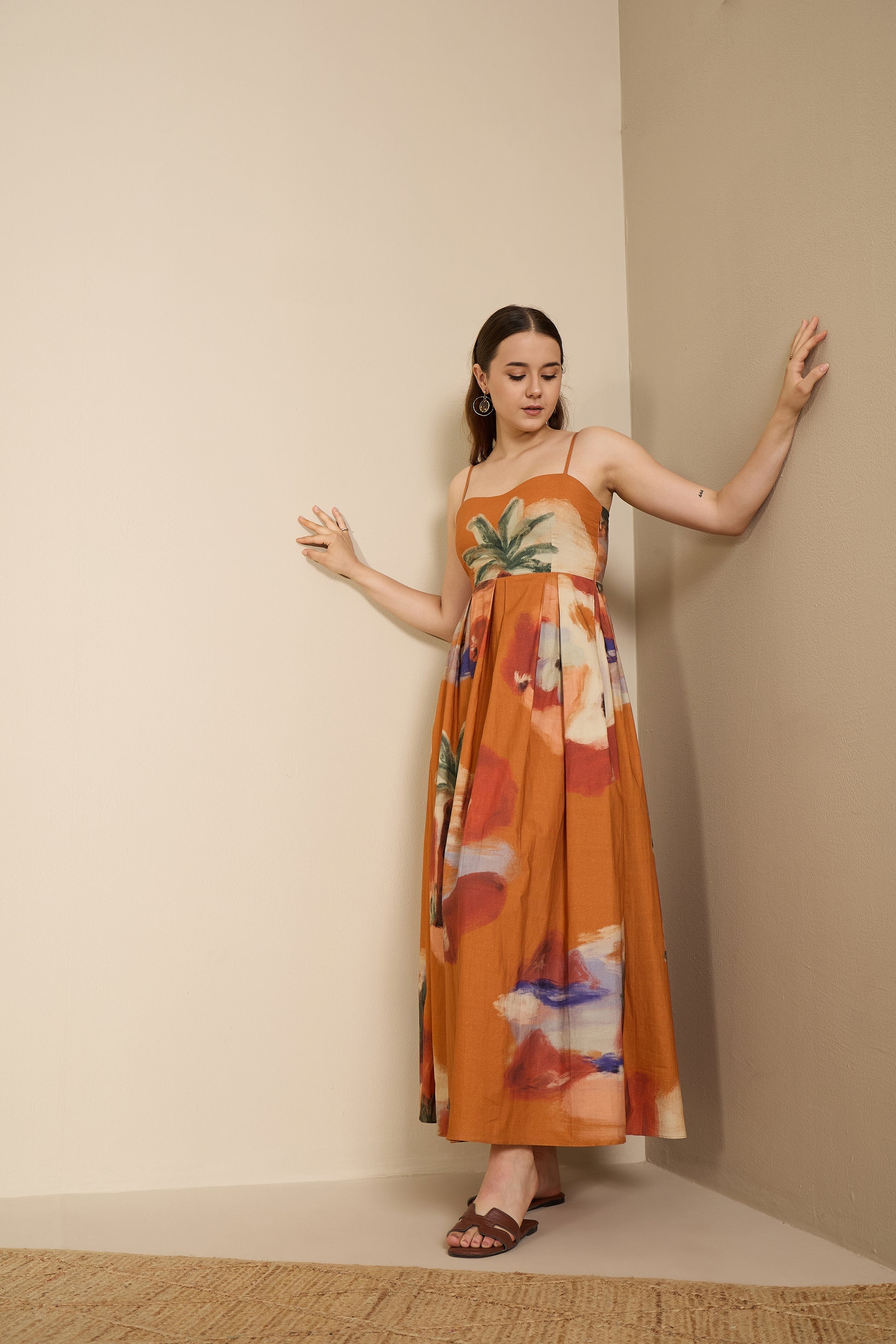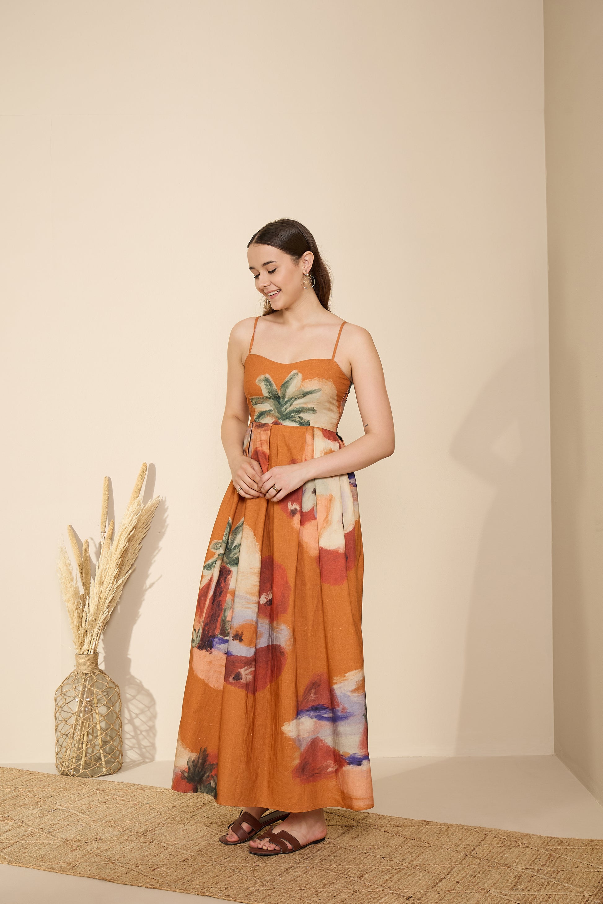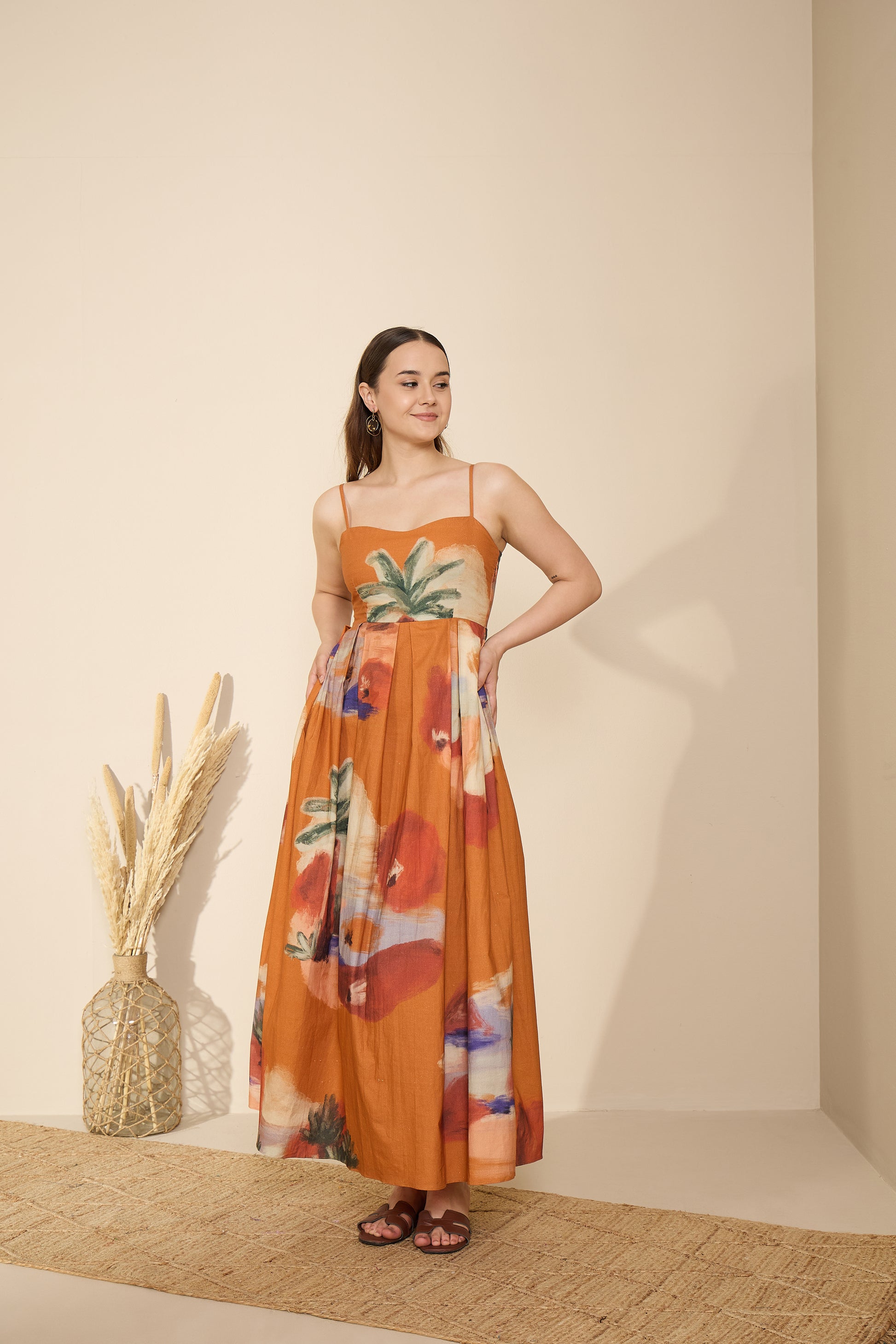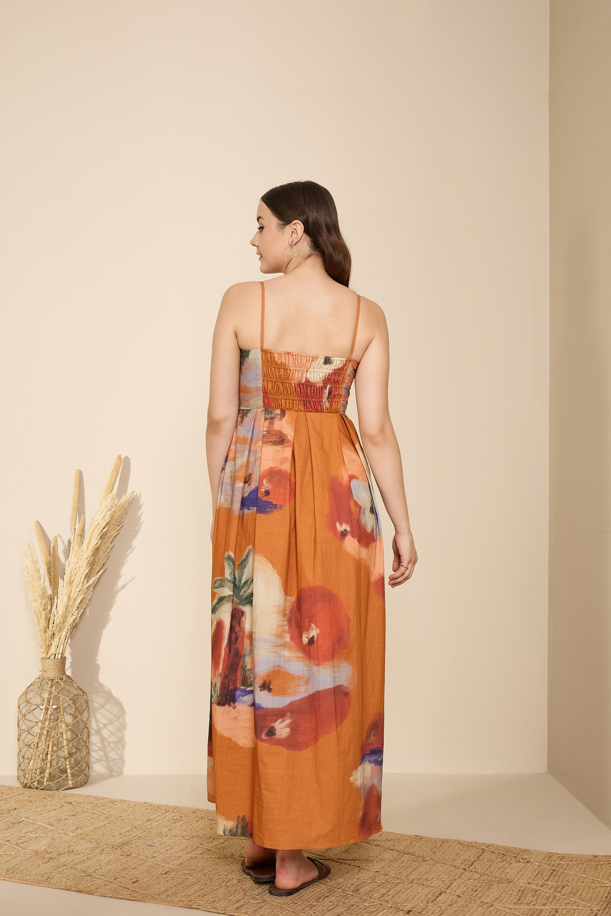 A sundress that feels like a slow sunset. The Terracotta Horizon Maxi Dress blends earthy tones with painterly blooms to create an effortlessly graceful silhouette. Its warm terracotta base, adorned with soft watercolor-inspired strokes of ivory, violet, and green, captures the poetic calm of golden hour.
