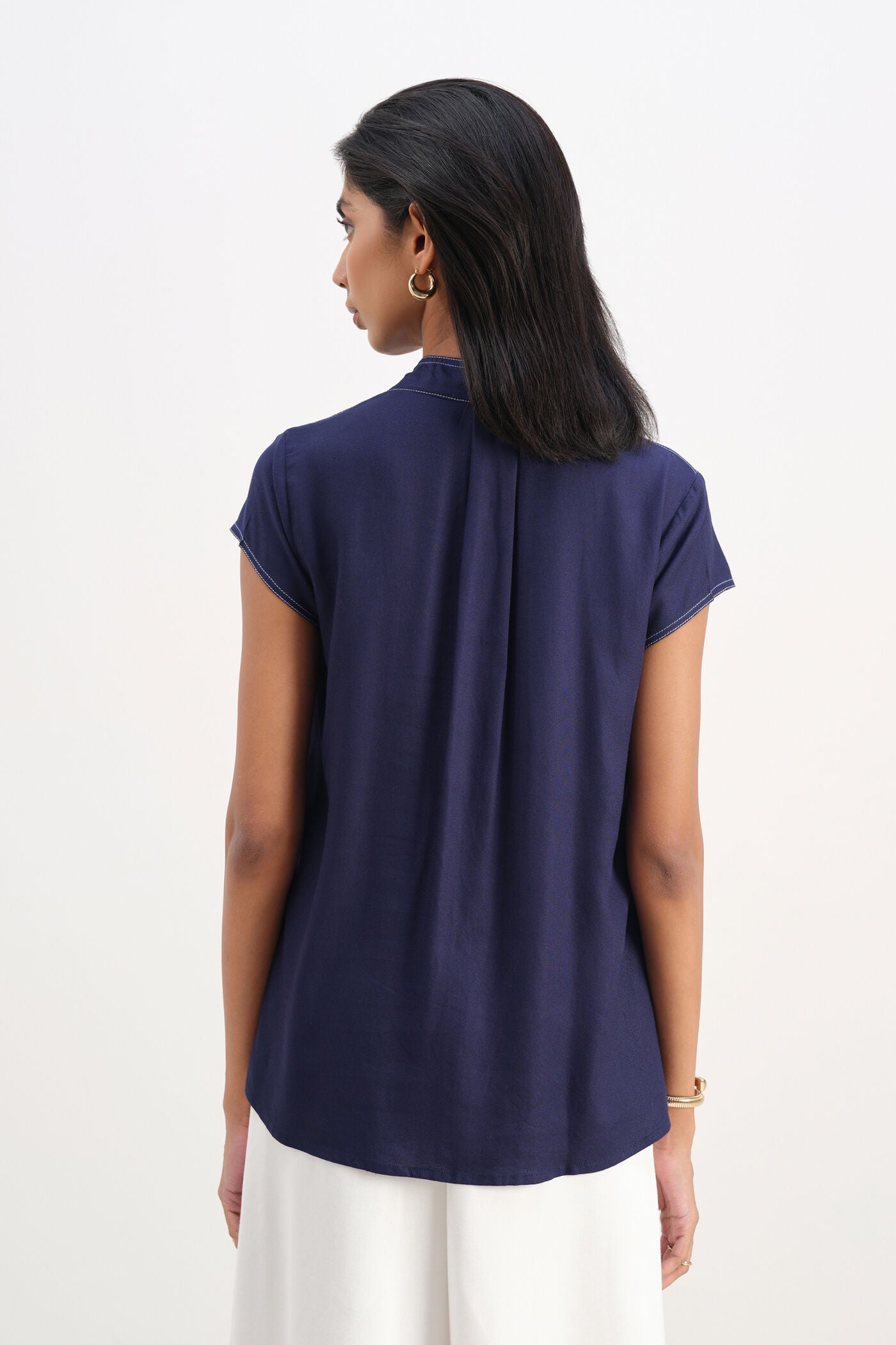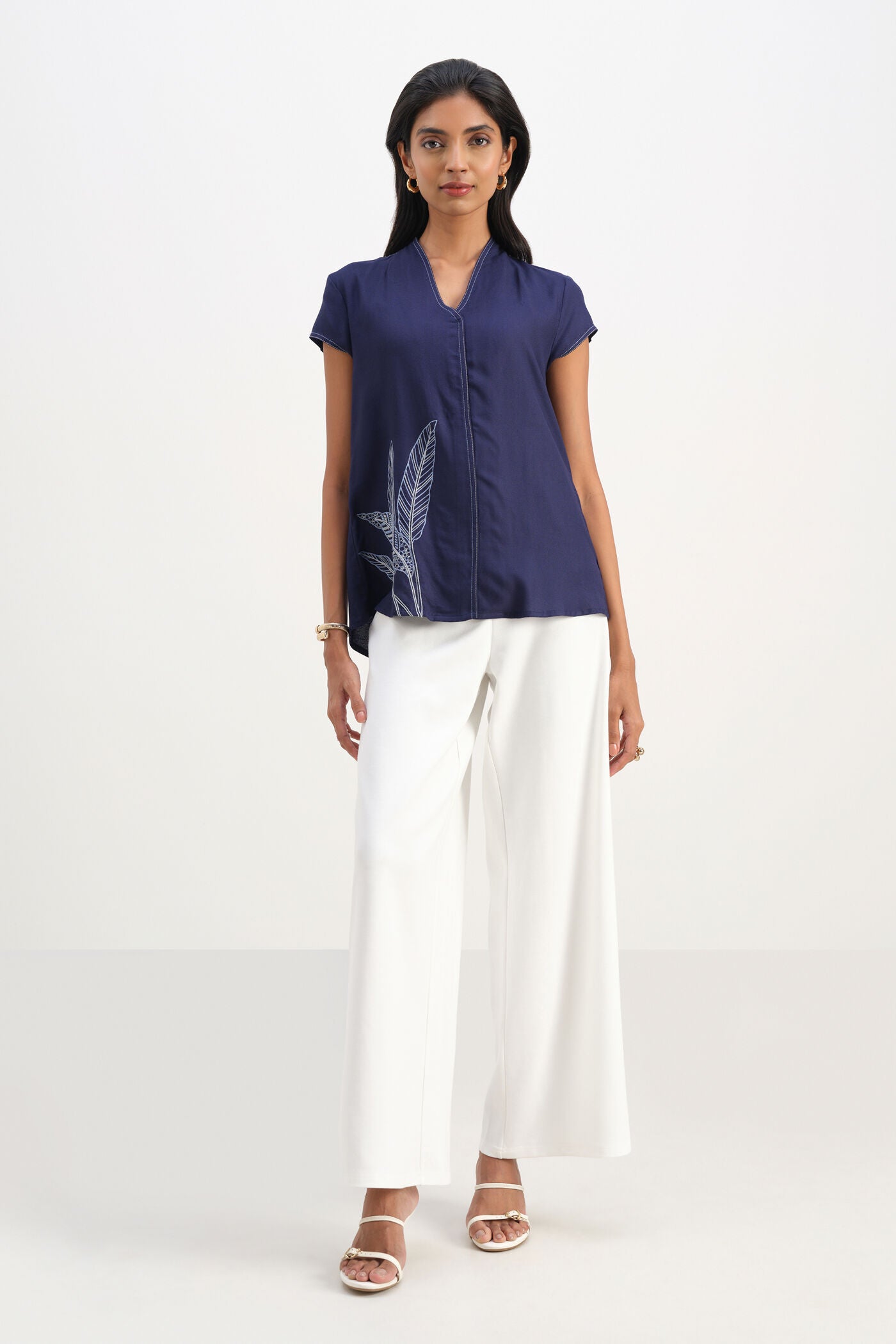 Understated yet effortlessly stylish, the Navy Blue Botanical Embroidered Short-Sleeve Top captures the essence of refined simplicity. Crafted from a soft, breathable fabric, it features delicate leaf embroidery near the hem — adding a graceful, nature-inspired touch. The minimal V-slit neckline and relaxed silhouette offer both comfort and sophistication, making it perfect for everyday elegance. Whether you’re heading to work, brunch, or a casual evening out, this top ensures a polished, versatile look.