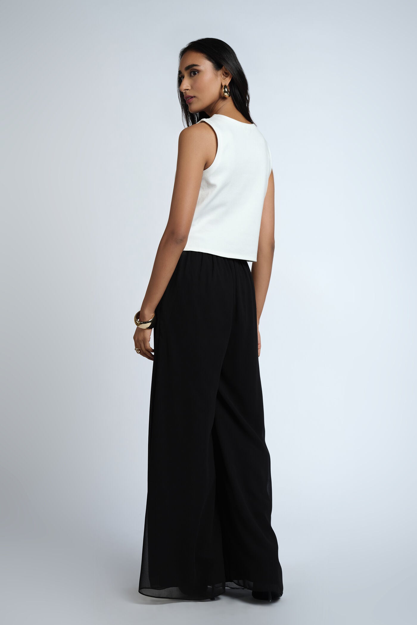 The structured white crop top is tailored from soft, breathable fabric for a clean, flattering silhouette. Paired with flowy black wide-leg trousers, the outfit offers a striking contrast and a graceful drape that flatters every movement. Add statement jewelry and sleek heels to complete your look of understated glamour.